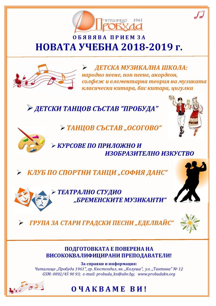 Стартира Новата учебна 2018/2019 година за школите и курсовете на читалище „Пробуда 1961″, кв. „Колуша“, гр. Кюстендил.