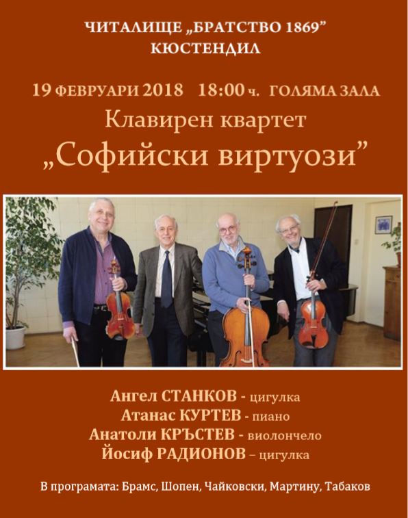 На 19 февруари 2018 г. от 18:00 ч. в Голямата зала на читалище „Братство 1869” гр. Кюстендил ще се проведе Концерт на Клавирен квартет „Софийски виртуози” – Ангел Станков – цигулка, Атанас Куртев – пиано, Анатоли Кръстев – виолончело и Йосиф Радионов – цигулка. В програмата: Брамс, Шопен, Чайковски, Мартину, Табаков.
